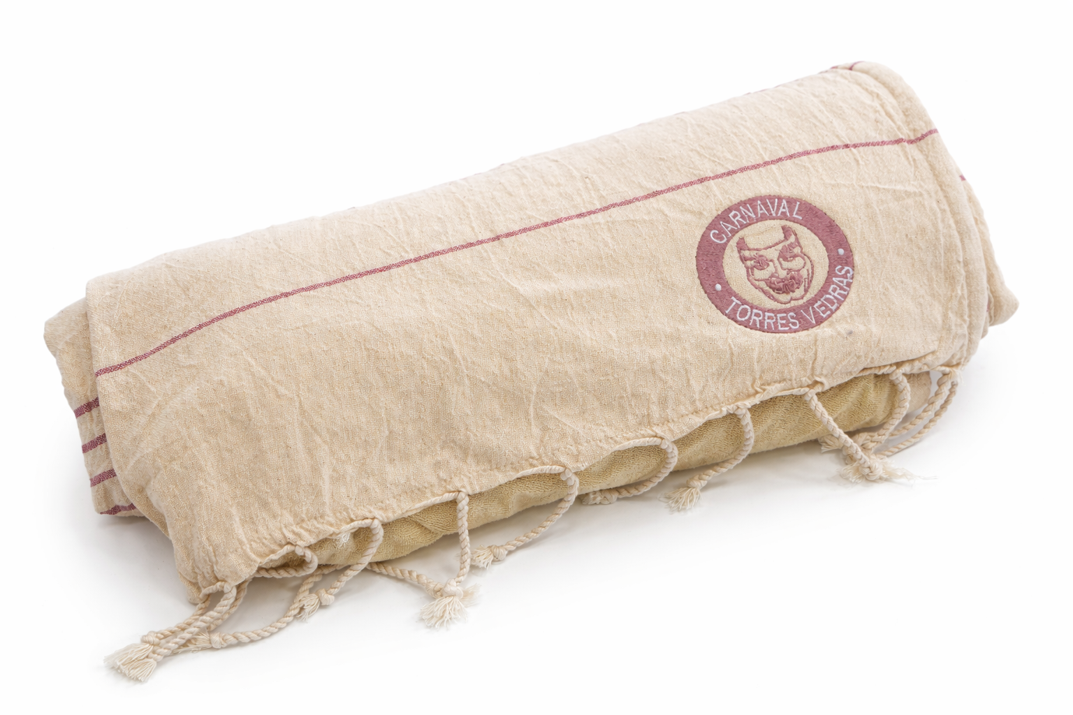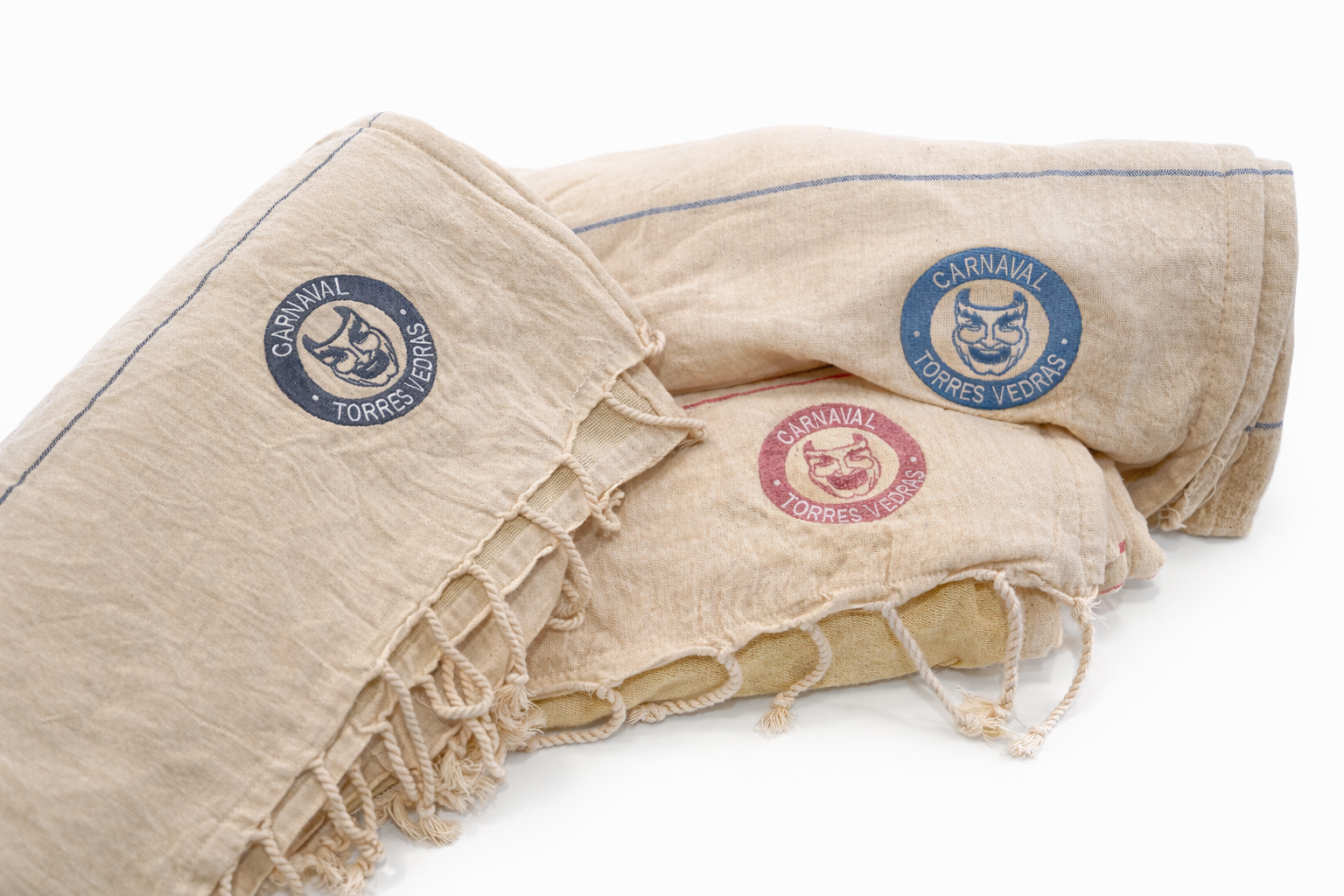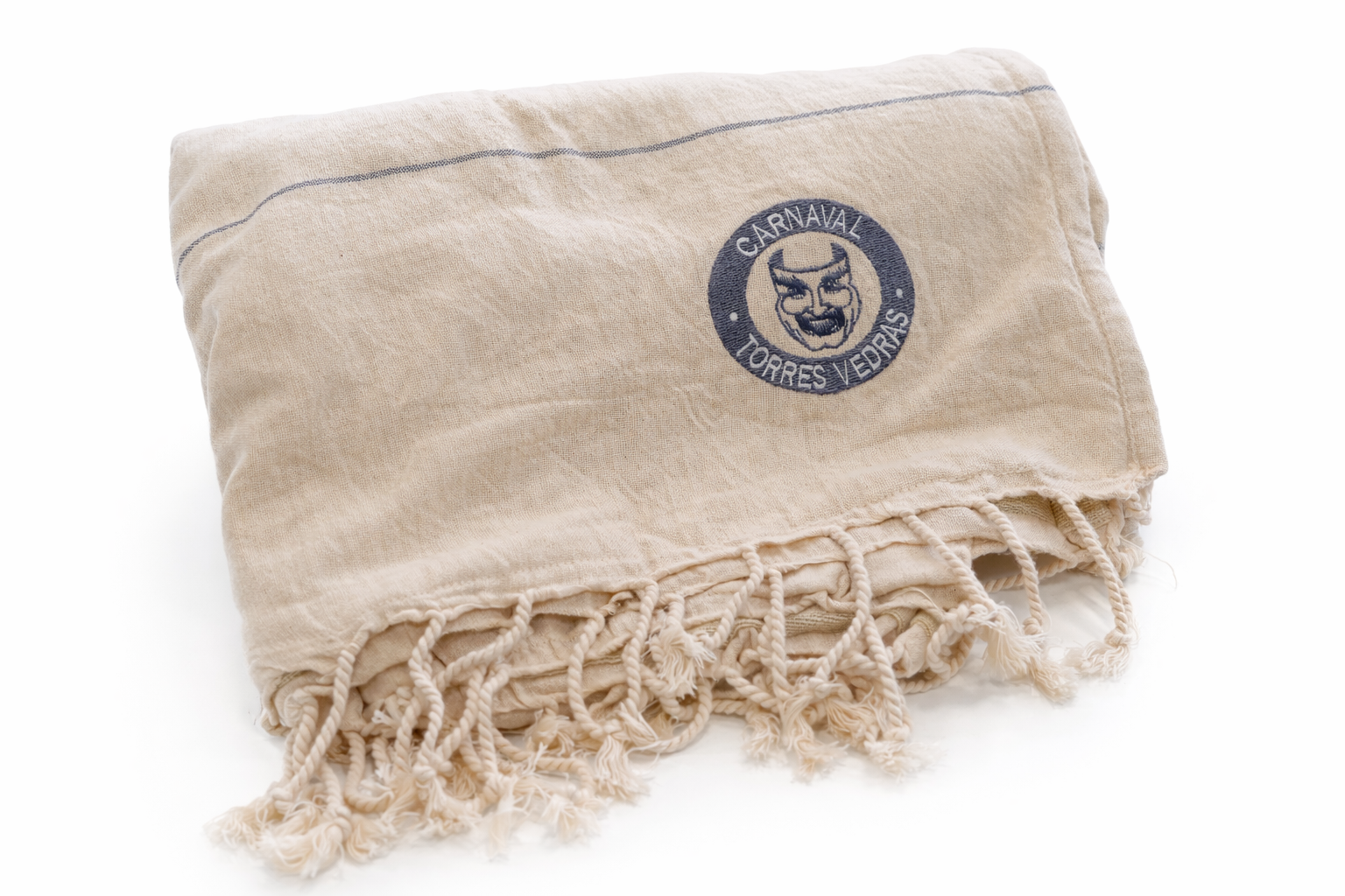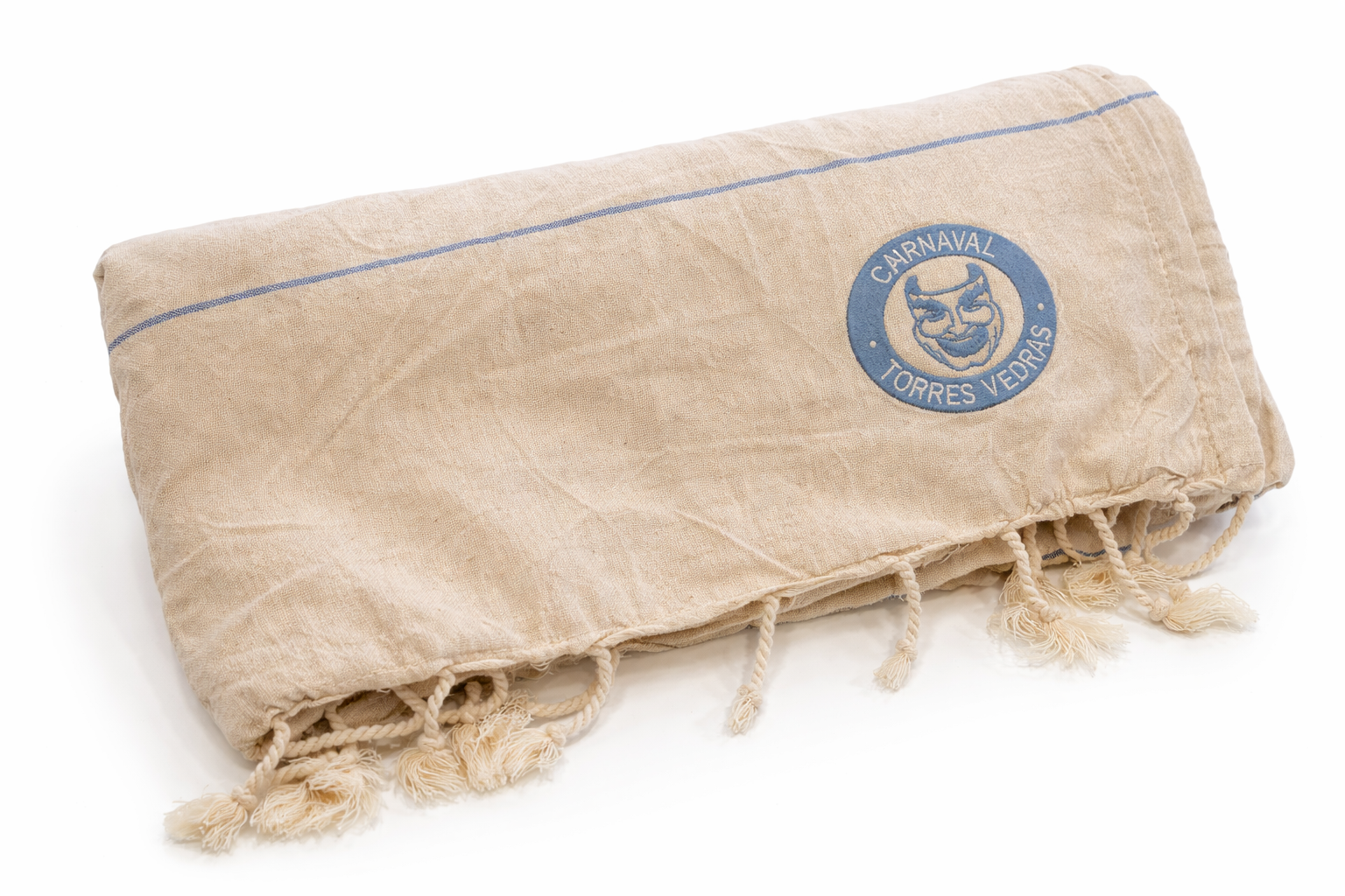 Toalha Pareo 100% algodão orgânico e Poliéster. Logo oficial do Carnaval de Torres Vedras bordado.